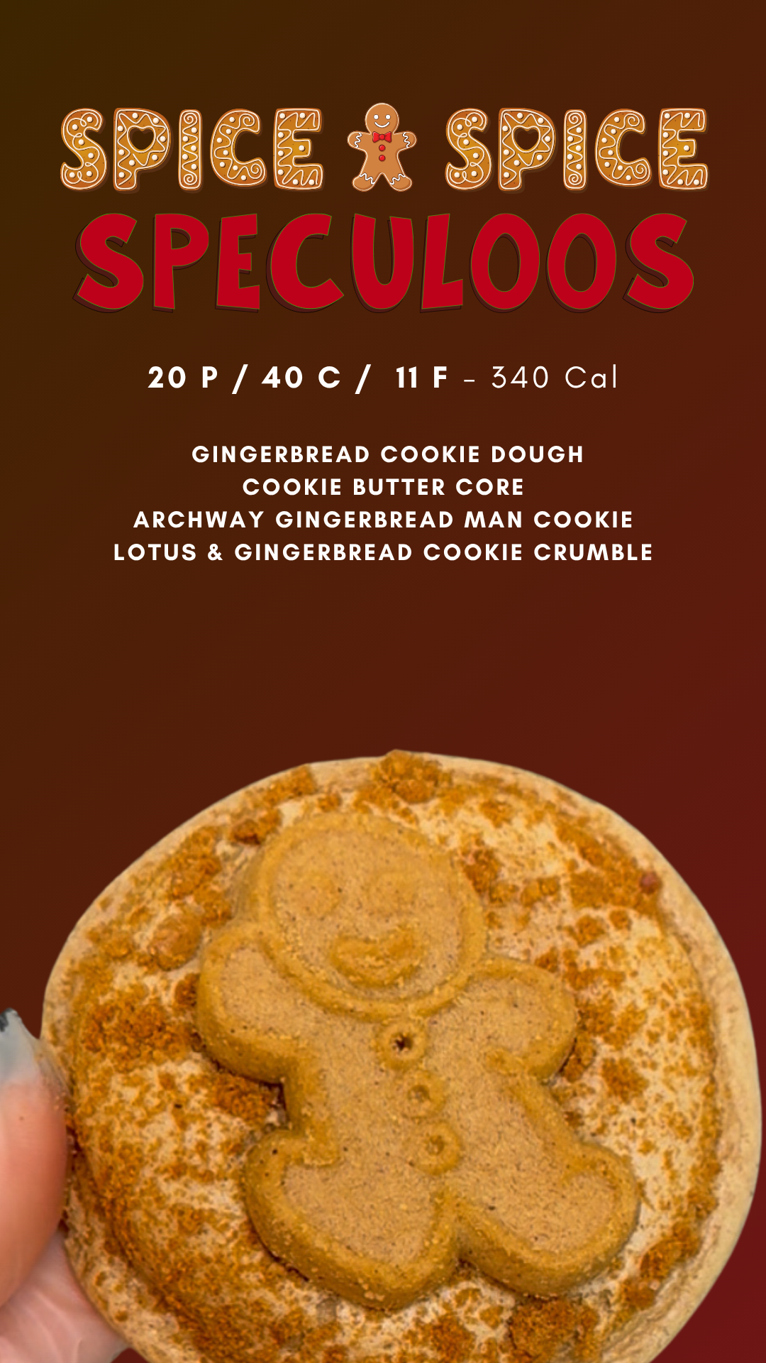 Gingerbread dough filled with a creamy cookie butter core, rolled in Lotus and gingerbread crumble, and crowned with a tiny gingerbread man.