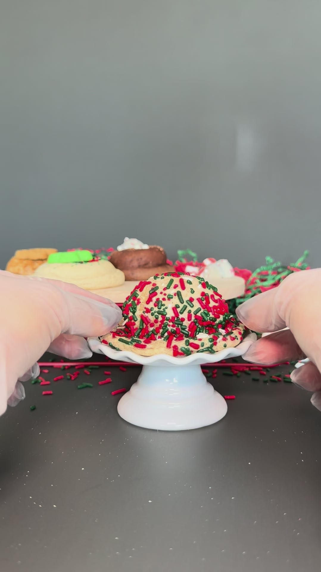 Sugar cookie and red velvet dough swirl together beneath a fluffy milk-inspired protein frosting, topped with sprinkles and a mini Christmas tree sugar cookie.