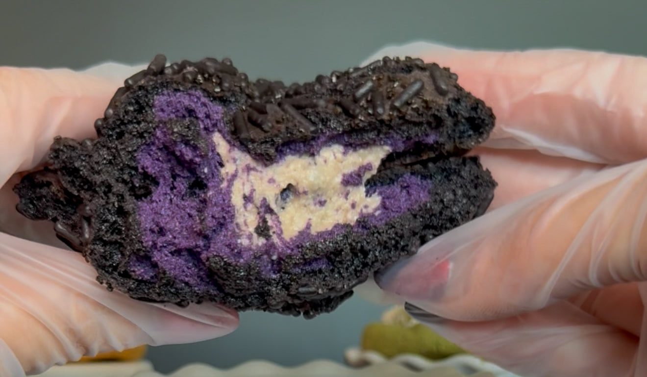 Black velvet chocolate dough meets Ube sugar cookie with a cookies & cream core, rolled in black sprinkles + sanding sugar.
