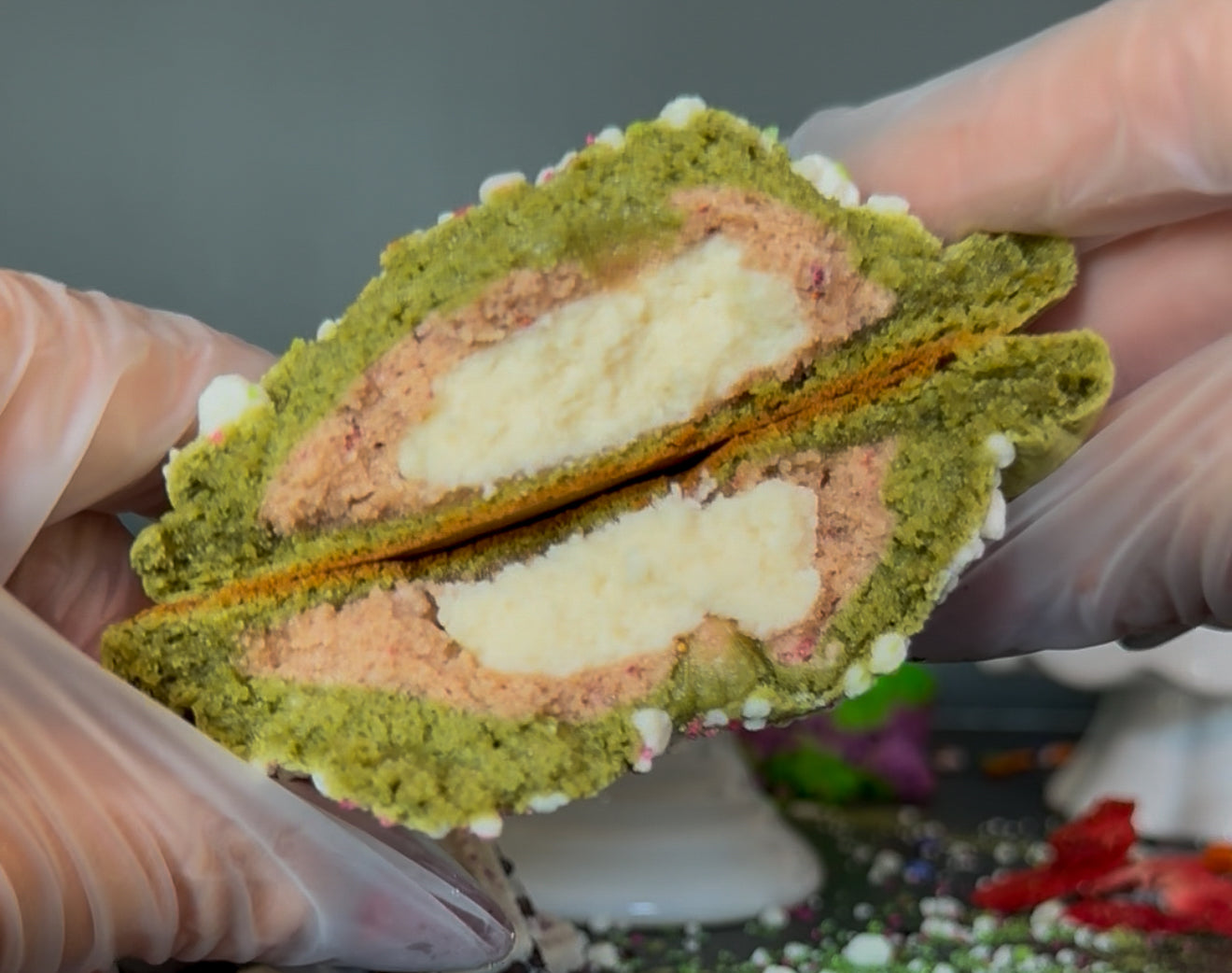 Matcha + strawberry in spellbinding harmony, stuffed with a white chocolate core and rolled in white chocolate + sanding sugar.